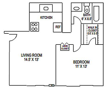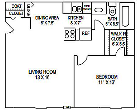 Our one-bedroom apartments offer spacious cabinetry, modern lighting, and the latest kitchen appliances to ensure you have everything you need to enjoy your stay. Our kitchen and bathrooms feature modern refrigerators, stoves, garbage disposals, and showers, and we offer secure on-site parking, free refuse pickup, and laundry facilities. Other amenities for each apartment include: